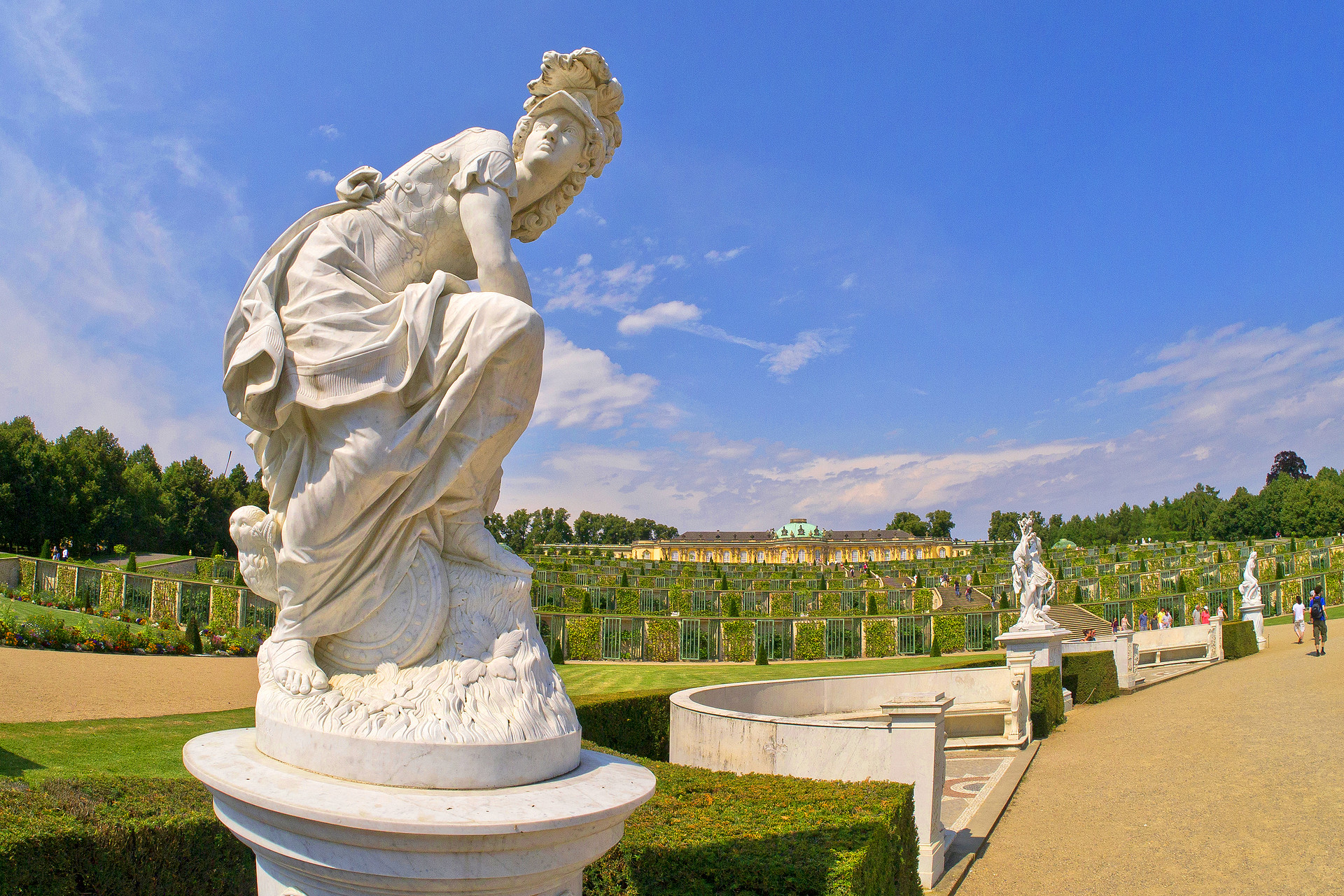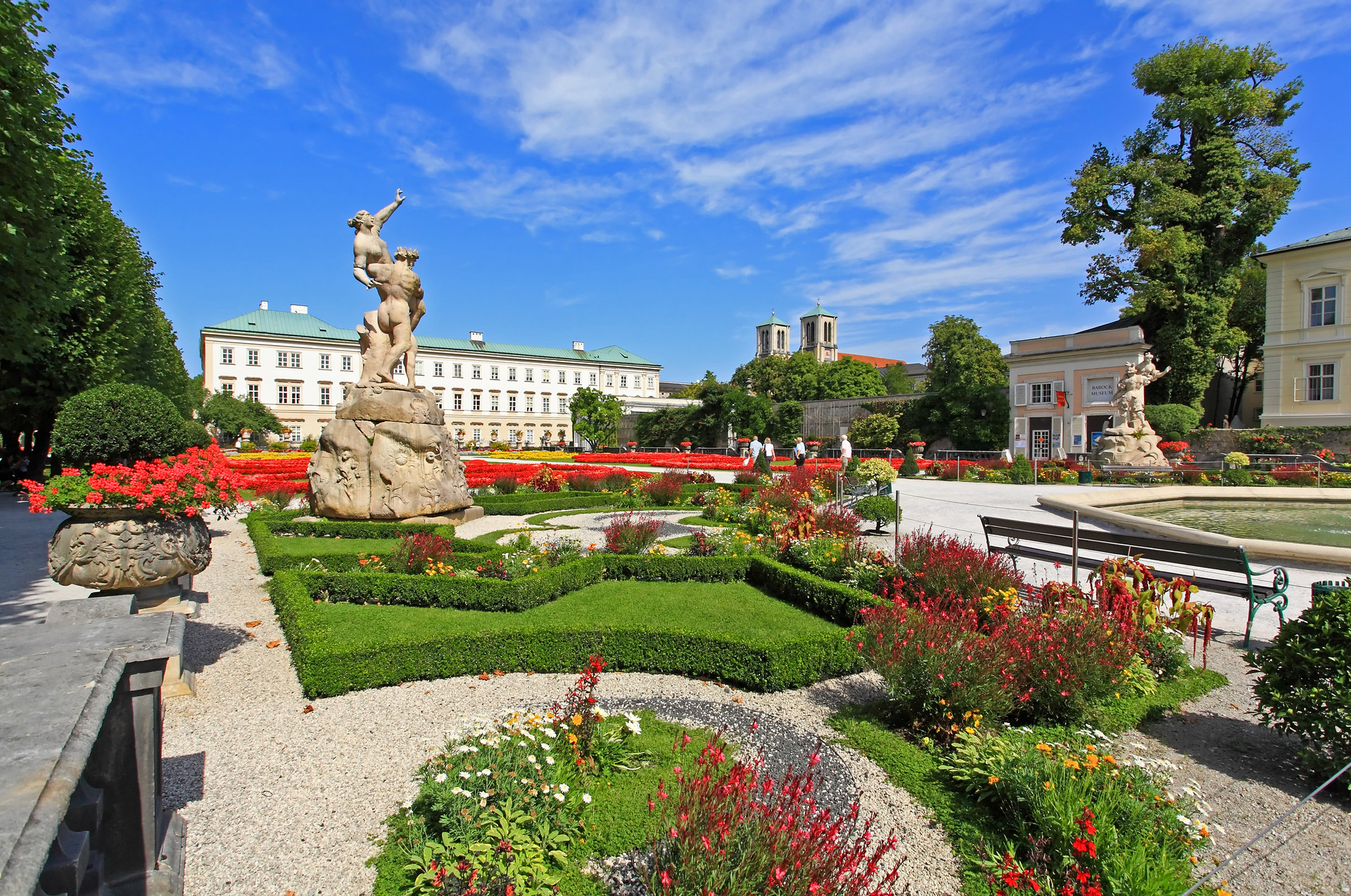【美泉宫后花园】是奥地利皇家花园,典型的法国式园林,硕大的花坛两边种植着修剪整齐的绿树墙,绿树墙内是 44 座希腊神话故事中的人物。园林的尽头是一座“海神泉”,向东便是皇宫名称由来但却不很起眼的“美泉”,美泉的正对面是一片人造的罗马废墟和一块方尖碑。美泉宫的至高点是凯旋门,海神泉的西侧是动物园和热带植物温室。